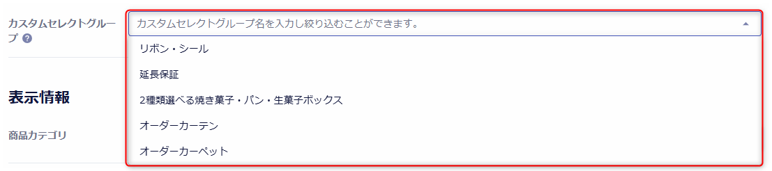 商品管理 / 機能・設定 / カスタムセレクトグループ で設定済みのカスタムセレクトグループを選択します。