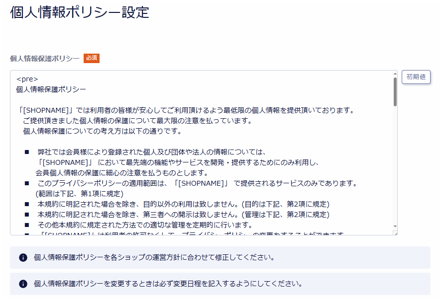 初期設定では、テキストエリアの中にあらかじめmakeshopが用意したショップの個人情報保護ポリシーの文言が記入されています。