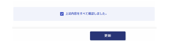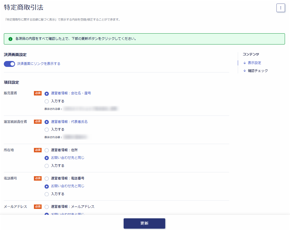 初めて「特定商取引法」画面を更新する際は、「更新」ボタンの上に「上記内容をすべて確認しました。」のチェックボックスが表示されます。