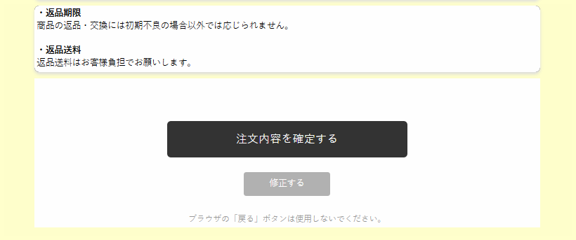 ショップデザイン / 機能・設定 / 決済画面デザイン にて「旧決済画面」をご利用の場合、決済第三画面の注文確定ボタン上部に表示される「返品期限」「返品送料」には、下記の内容が表示されます。