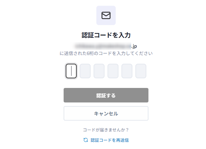 登録されている会員メールアドレスあてに認証コード(6桁の数字)が送信されます。有効期限は10分間です。
