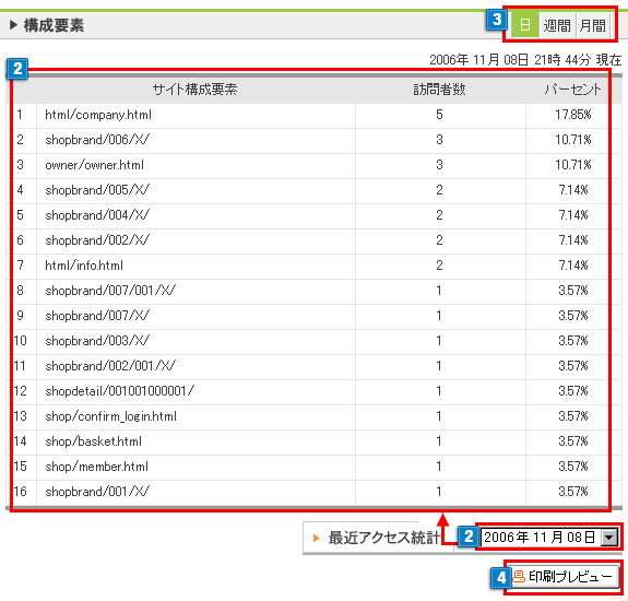 「パーセント」は各ページにアクセスされた全訪問者数に対する各ページごとの比率が表示されます。 - 2約2ヶ月遡って過去のデータを参照することができます。