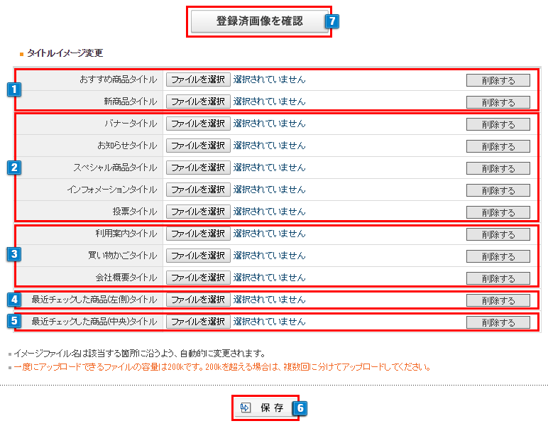 - 5「最近チェックした商品」中央画面表示設定にしている場合のタイトル画像を参照ボタンより登録できます。