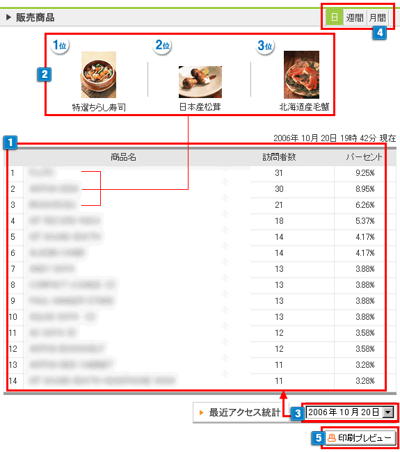 「パーセント」は商品にアクセスされた全訪問者数に対する商品ごとの比率が表示されます。 - 21~3位までのアクセスの多い商品のランキングを画像にて確認できます。
