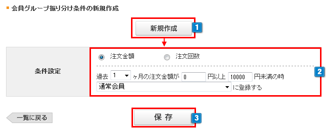 2会員グループの振り分けの条件として注文金額または注文回数を選択します。