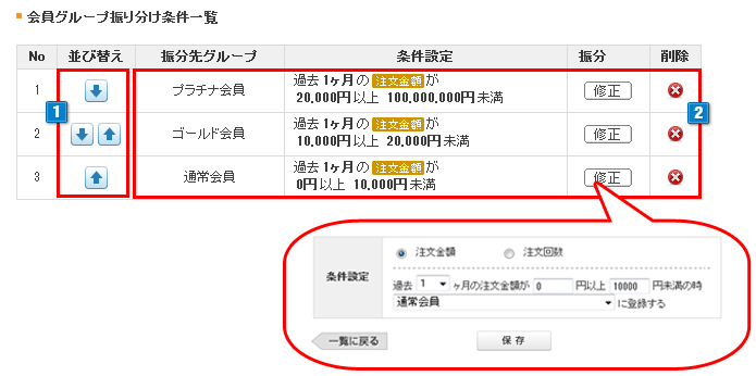 注文金額または注文回数が指定した範囲に満たない場合は、ランクの低い会員グループに振り分けられます。
