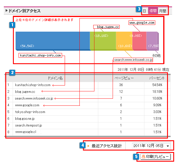 「パーセント」は確認の取れたドメインからショップへ訪れた、全訪問者数に対する各ドメインごとの比率が表示されます。 - 3【日】、【週間】、【月間】ごとのドメイン別アクセスが参照できます。