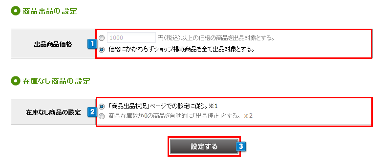 1)【出品状況】で「全商品出品する」にし、【商品出品条件の設定】をおこなった場合