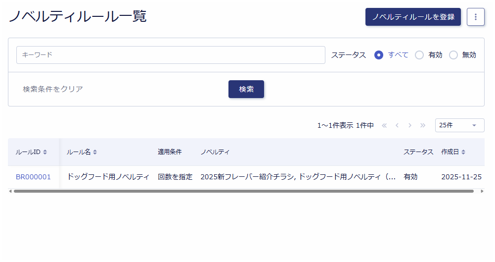 ノベルティルールの登録、編集、削除、検索などの操作が可能です。