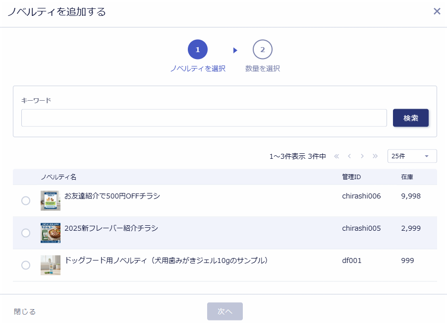 「ノベルティを追加する」ボタンをクリックすると、ノベルティ選択モーダルが表示されます。