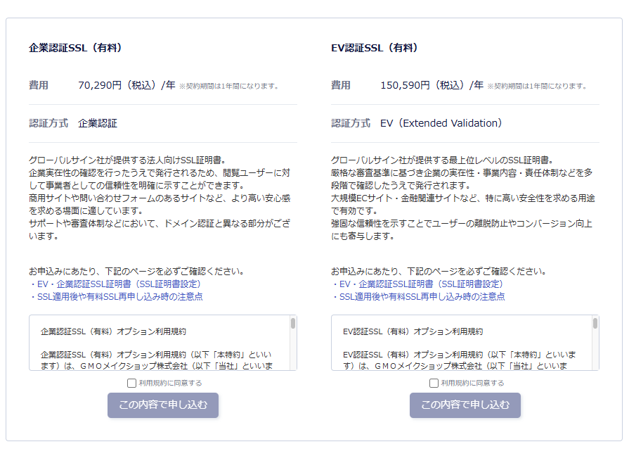 本サービスでは、GMOグローバルサインの企業認証SSL・EV認証SSL証明書を導入することが可能です。