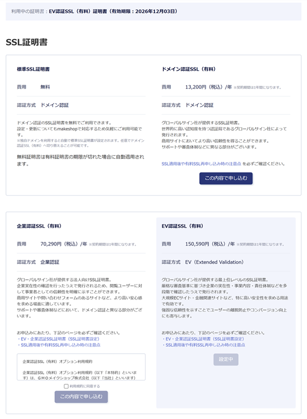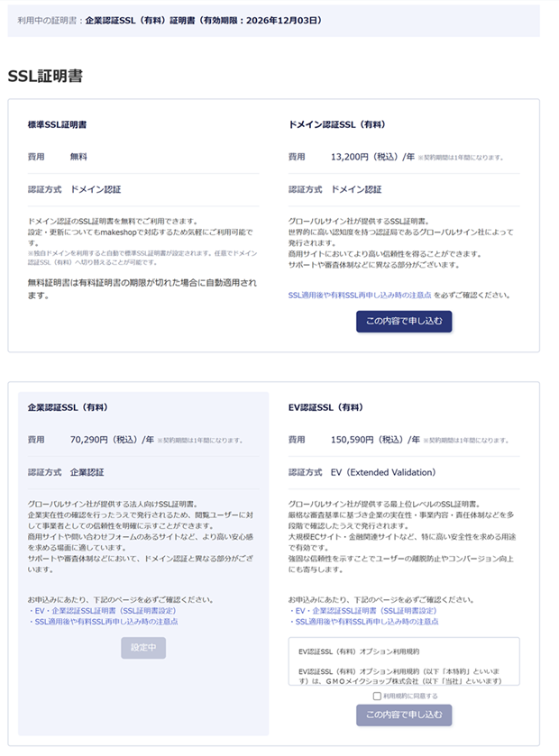 ショップ構築 / 設定 / 接続・通信 / SSL / SSL証明書設定 の「企業認証SSL(有料)」「EV認証SSL(有料)」に表示されている「この内容で申し込む」ボタンよりお申し込みください。