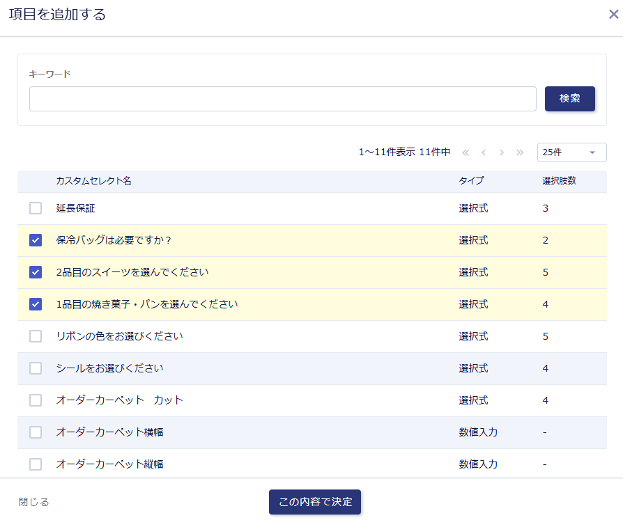 使用する「カスタムセレクト(パーツ)」にチェックを入れて「この内容で決定」をクリックし、グループに追加します。