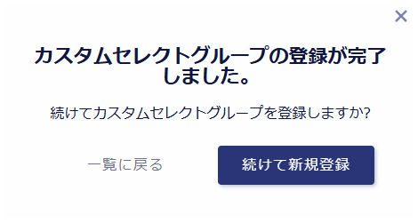 保存が完了すると、「カスタムセレクトグループの登録が完了しました 続けてカスタムセレクトグループを登録しますか?」と表示され、「一覧に戻る」「続けて新規登録」から選択できます。