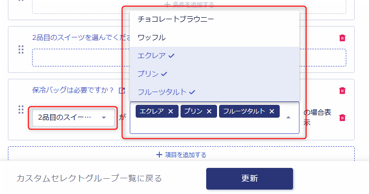 「質問2」で「要冷蔵スイーツ」を選んだ場合のみ ⇒「保冷バッグは必要ですか?」を表示