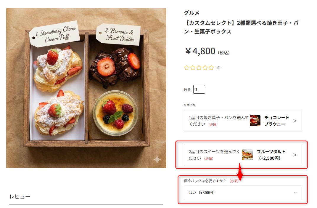 「カスタムセレクト」は、商品のサイズやカラー(バリエーション)とは別に、ラッピングの選択や延長保証、長さ指定などの「選択肢」を商品に設定できる機能です。