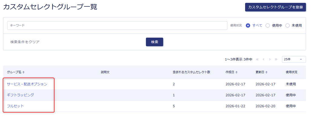 設定画面:商品管理 / 機能・設定 / カスタムセレクトグループ 一覧を表示・検索できます。