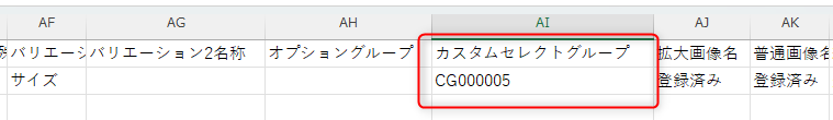グループID:自動で割り振られるIDです。「CG000005」のように、「CG」から始まる6桁の数値で構成されます。「商品情報一括アップロード・ダウンロード」CSVで利用します。